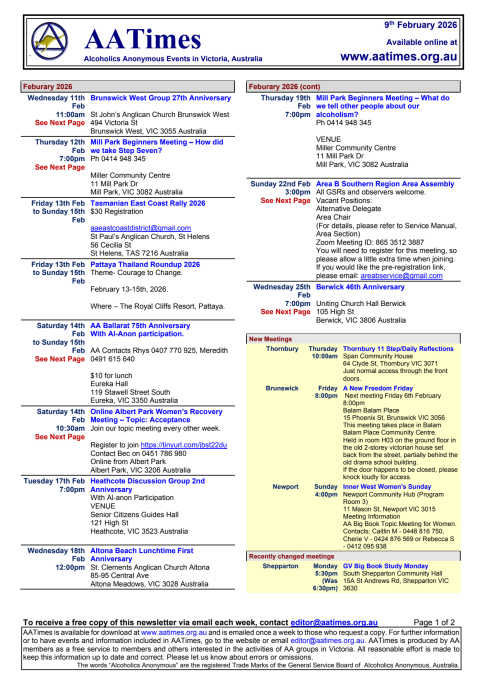 You can find out about AA events in our Events Page. Or you can download the weekly printable newsletter below.