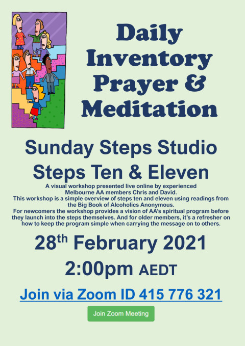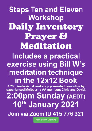 This workshop is a simple and inspiring overview of the steps that become our daily program. It includes a practical exercise in meditation from AA literature. For newcomers it provides a vision of AA’s spiritual program before they launch into the steps themselves. And for older members, it’s a refresher on how to keep the program simple when carrying the message on to others.
